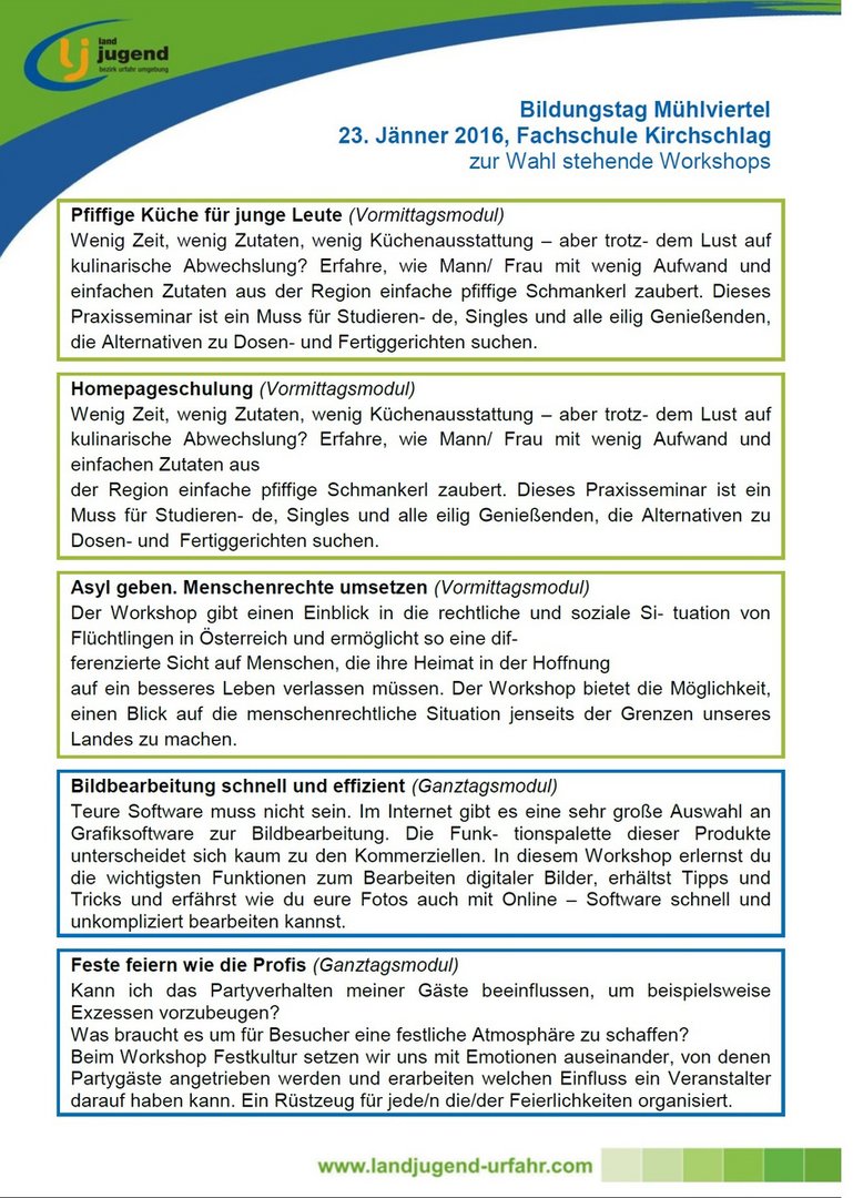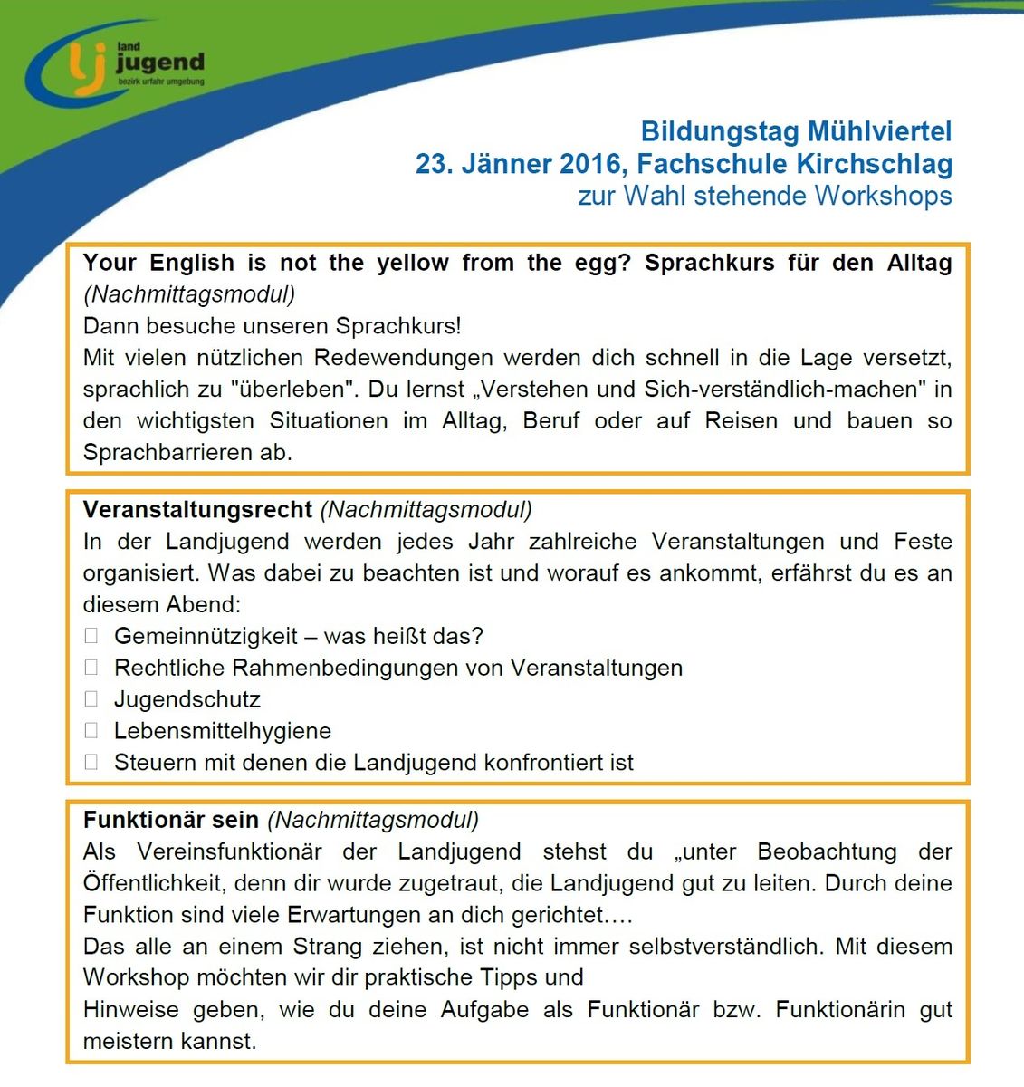 BILDUNG wird bei der Landjugend groß geschrieben, daher gibt es auch heuer wieder am 23 Jänner den Bildungstag in Kirschschlag, bei dem aufgrund verschiedenster Module sicher für jeden das Passende dabei ist. Nähere Informationen zu den zur Wahl stehenden Workshops findet ihr hier.