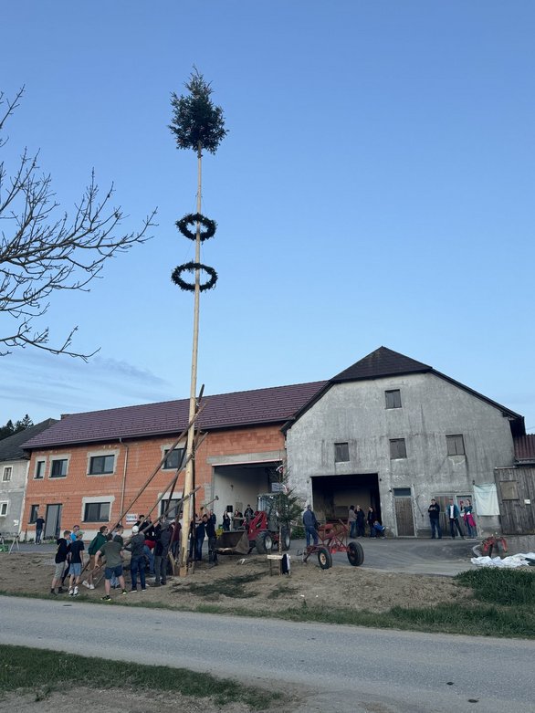Am 30. April 2024 wurde der Maibaum von der LJ-Schenkenfelden aufgestellt. Schon bei den Vorbereitungen halfen alle Mitglieder fleißig mit. Der Maibaum wurde bei unserem Leiter Dani zuhause, mit Hilfe des ganzen Dorfes Lichtenstein aufgestellt und ins Lot gebracht. Schon kurze Zeit nach dem Aufstellen mussten wir leider feststellen, dass der Wipfel neben dem Baum lag. Trotzdem ließen wir den restlichen Baum stehen. Es gab auch ein paar Versuche unseren Maibaum zu stehlen (unter anderem von unseren Nachbarn, der Landjugend Reichenau), die wir aber alle erfolgreich abwenden konnten.