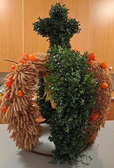 Eine Woche später, durften wir dann unsere frisch gebundene Erntekrone beim Erntedankfest in der frisch renovierten Kirche voller Stolz präsentieren!💪👩🌾